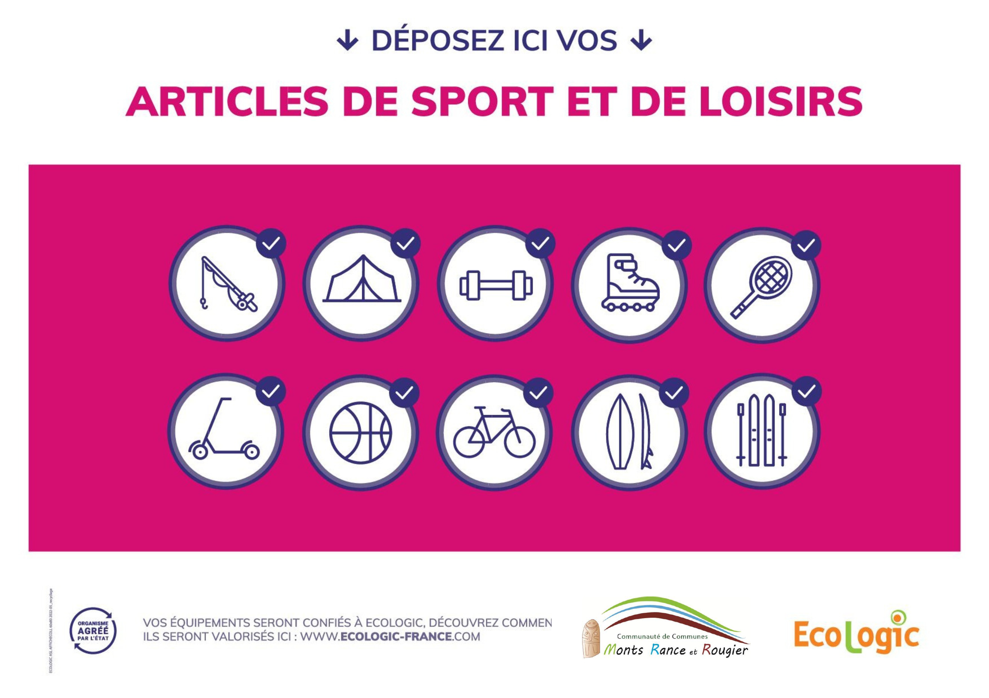 Déposez vos articles de sport et de loisirs en déchèterie : ils pourront être réemployés ou recyclés grâce à une filière dédiée.